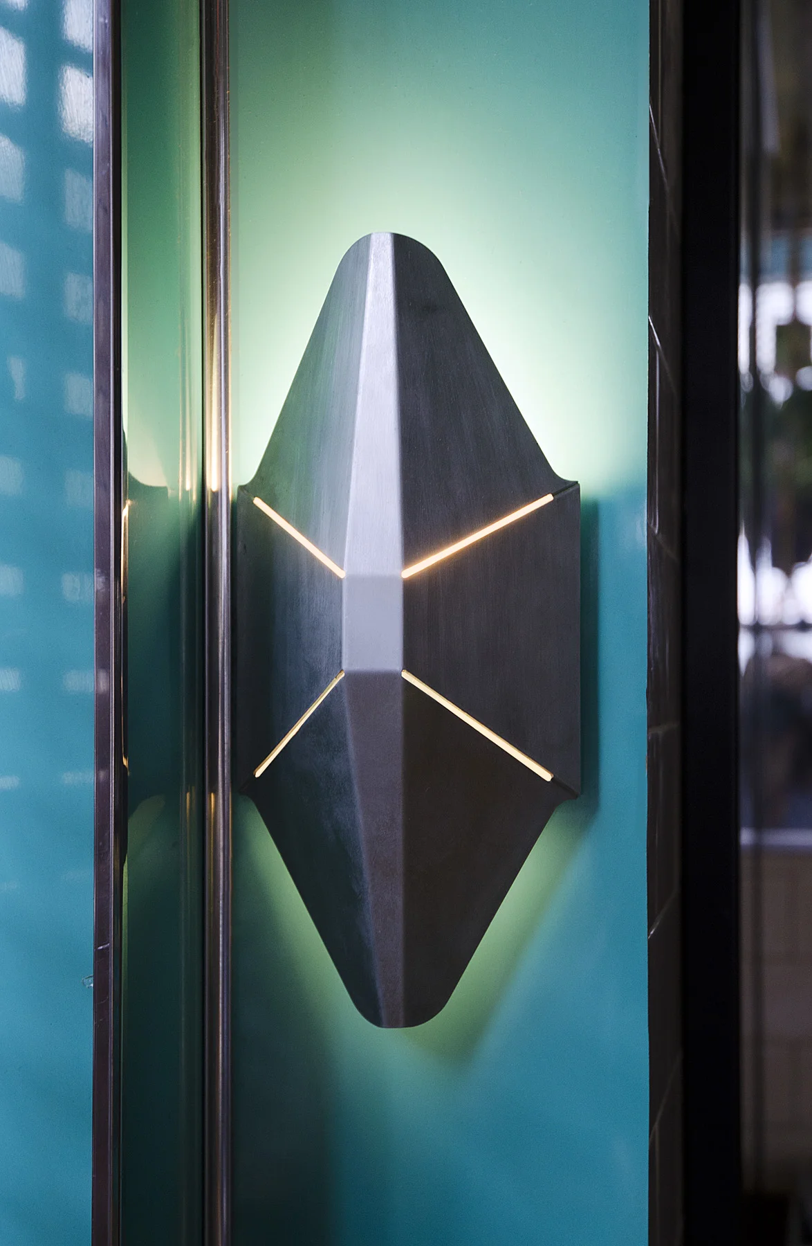 This project was a custom lighting solution for a lively Brooklyn Restaurant. The challenge was to project a certain attitude and mood in addition to indirect ambient light. The folded and brazed zinc cover plate provides a unique sculptural accent to the space.